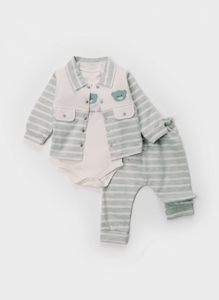 Introduce your little one to comfort and style with this charming 3-piece hooded jacket set. Featuring a cozy long-sleeve romper paired with a matching hooded jacket, this ensemble keeps your baby warm while looking absolutely adorable. The soft, breathable fabric ensures all-day comfort for delicate skin, while the practical design makes dressing and diaper changes effortless. Perfect for layering through cooler months or wearing solo on mild days, this versatile set becomes an instant wardrobe essential. Give your baby the gift of snug sophistication that parents love and babies adore.